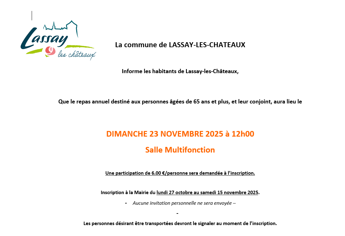 Le traditionnel repas des aînés se déroulera le dimanche 23 novembre, à 12h00, à la salle multifonction. Les personnes souhaitant être transportées pourront le signaler lors de leur inscription.